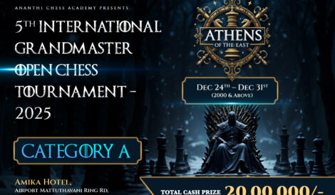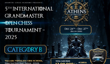 Blitz,FIDE Rating Tournament Event Date 28th - 30th December, 2025 Event Category Below – 1800 Event Venue VALLABA VIDYALAYA CBSE SCHOOL, Alagar Kovil Main Road, Arambanur, Madurai - 625104. AOE 5th International Grandmaster Open Chess Tournament – 2025 – CATEGORY DDate: 28th – 30th December – 2025 (Below – 1800)Venue: VALLABA VIDYALAYA CBSE SCHOOL, Alagar Kovil Main Road, Arambanur, Madurai – 625104.TOTAL CASH PRIZE: Rs. 12,00,000/-4 Cars & 50 CyclesEntry Fee: All Players: INR 6,000/-For Madurai District Registered players INR 5,500/- Register Here Download Brochure