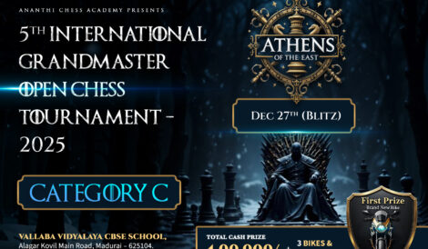 FIDE Rating Tournament,Open Tournament Event Date 19th – 23rd Nov 2025 Event Category FIDE Rating OPEN Event Venue Adhiyamaan College of Engineering, Hosur Little England 5th International FIDE Rated Open Chess Tournament – 2025JOINTLY ORGANIZED BY :ViYUGAM CHESS ACADEMY(Affiliated to Krishnagiri District Chess Association)ANANTHI CHESS ACADEMY(Affiliated to Madurai District Chess Circle)Date: 19th – 23rd NovVenue: Adhiyamaan College of Engineering, HosurEntry Fee: ₹3000Free for GM, WGM, IM & WIMFree Accommodation to All Players Register Here Download Brochure